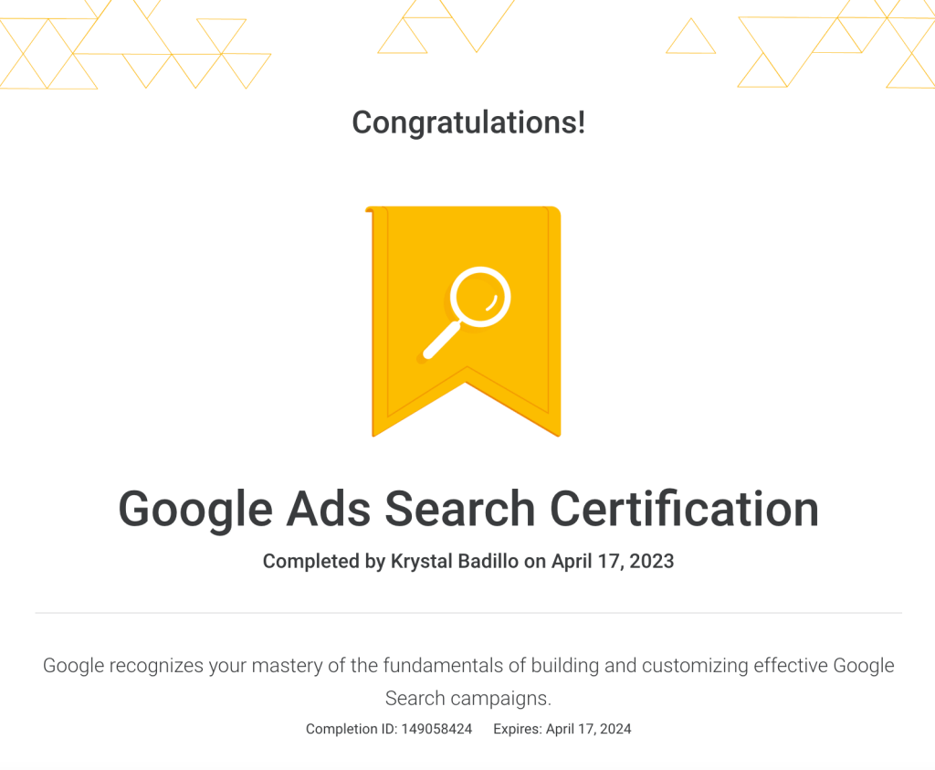 I now have insight into how to build a Google Search Campaign with an effective strategy to reach certain objectives. I am knowledgeable in how to increase web traffic, sales, as well as leads using Google Search.